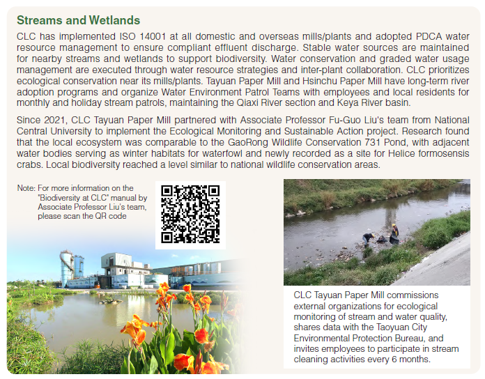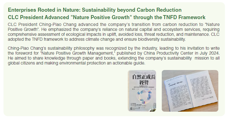 CLC adopted the TNFD Version 1.0 frameworks and initiated an internal L.E.A.P. analysis to comprehensively assess its dependence and impact on natural resources. CLC integrated industry, government, and academia resources to conduct natural capital and biodiversity research projects at its plants, strengthening risk management and corporate resilience. Beginning in 2025, CLC will disclose in accordance with the TNFD frameworks, focusing on governance, strategy, risk management, and metrics to ensure business operations are aligned with environmental sustainability, and will collaborate with industry partners to advance sustainable economic and environmental development.