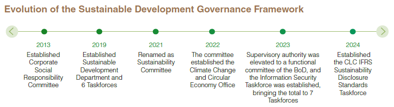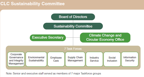 Sustainable Development Governance StructureThe CLC Board of Directors serves as the highest decision-making and supervisory body for sustainable development, annually reviewing sustainability project progress, management policies, and execution through reports from the sustainability committee and its executive secretary. The sustainability committee oversees 7 taskforces: Corporate Governance and Integrity, Environmental Sustainability, Employee Care, Supply Chain Management, Industry Services, Social Inclusion, and Information Security. Each taskforce comprises first-level supervisors and senior staff from relevant departments, with ESG responsibilities assigned by function and extended to subsidiaries. The committee established the Climate Change and Circular Economy Office, led by the President and the R&D supervisor as deputy, and consults external experts, including the Taiwan Green Productivity Foundation. The taskforces hold monthly meetings to track progress and effectiveness, reporting quarterly to the Board. The Board arranges annual corporate sustainability training for directors.