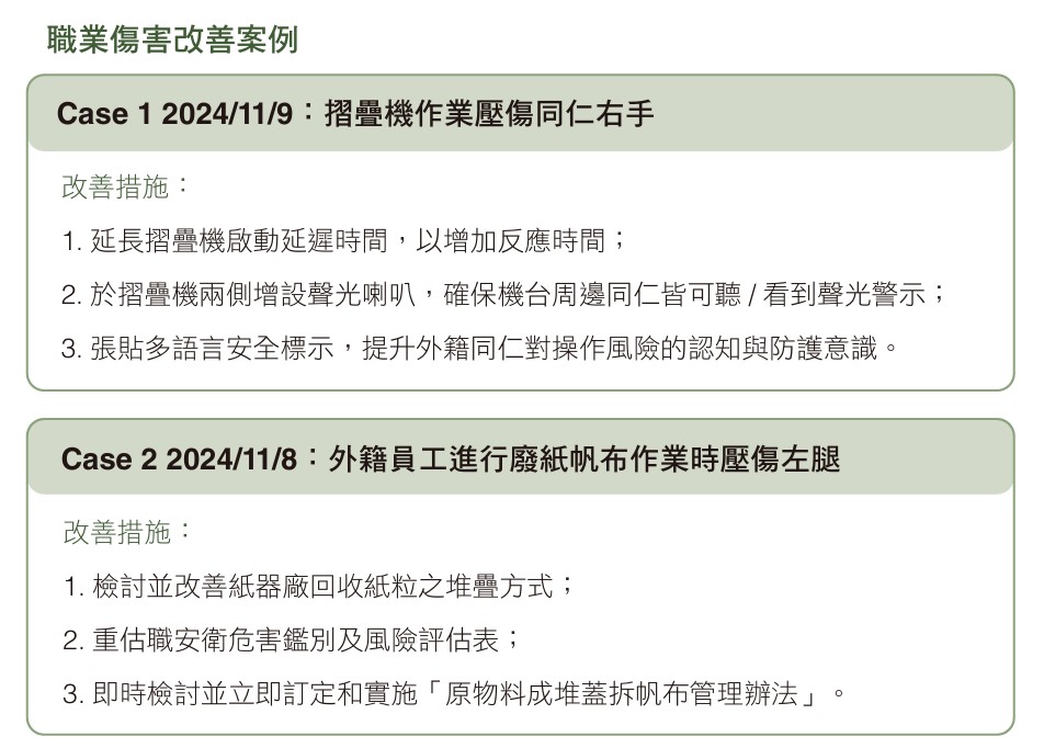 為強化預防管理與持續改善,正隆亦將「虛驚事件」視為潛在風險的重要指標,透過管理系統追蹤通報紀錄與矯正作為,降低潛在危害發生的可能性。此外,正隆大力推動提案改善制度,鼓勵員工針對作業安全與環境提出創新建議。2024年安全衛生類總提案數達4,975件,並於年終業務研討會中公開表揚績優廠部。