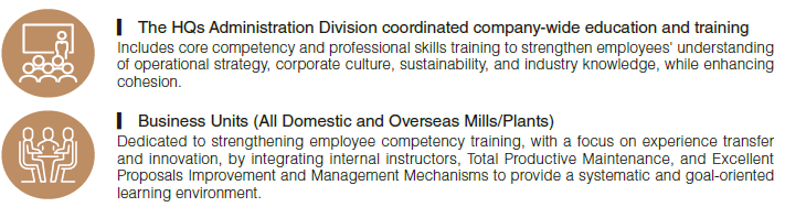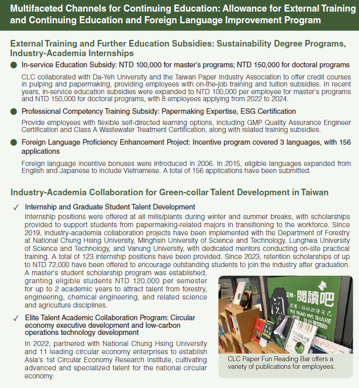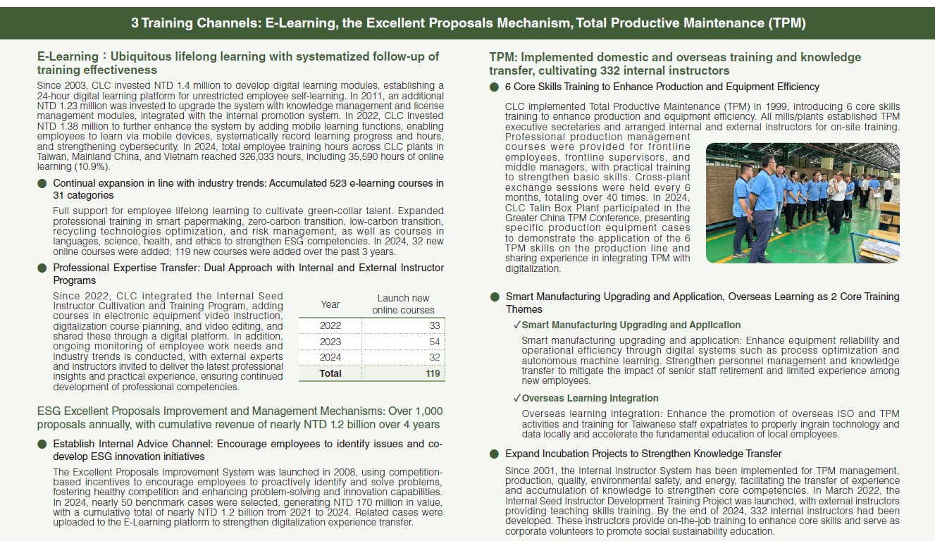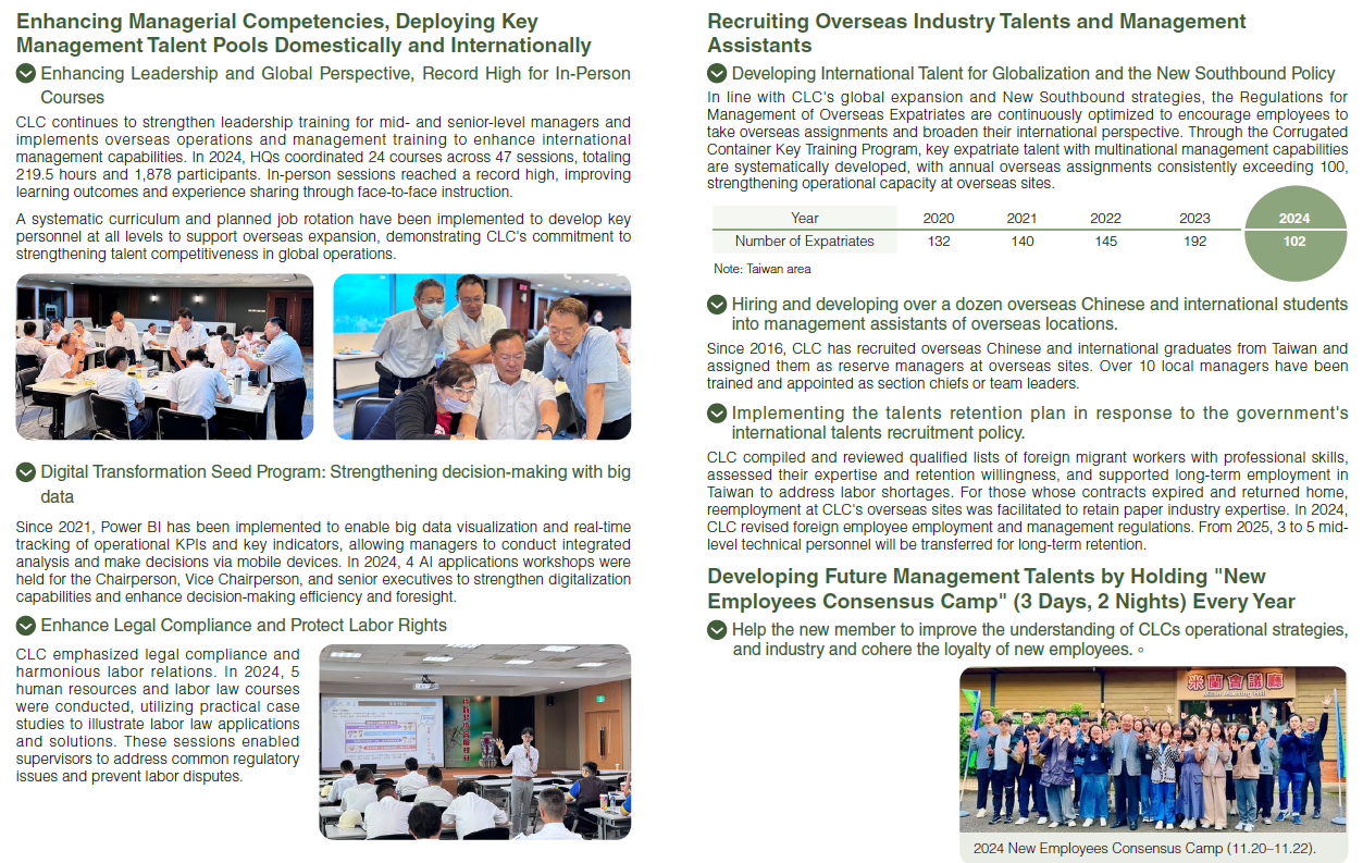 CLC established a 10-year talent development plan under the "Smart Low-carbon Intelligent Paper" strategy, defining core and professional competencies by position and grade in technologies and engineering, ESG governance, AI Digitalization, crisis management, and international languages. The plan integrates digitalization-based talent management and evaluation systems to upgrade capabilities across the Consolidated Company. Internal training goals and curricula are dynamically set according to industry trends, with long-term management development programs for key roles. The company promotes academic collaboration, internships, interdisciplinary programs, and internal academies. Mandatory courses for promotion include ESG Sustainable Operations and Code of Ethical Conduct and Anti-corruption Advocacy, strengthening ESG knowledge and ethical compliance to build a stable sustainable talent pool.