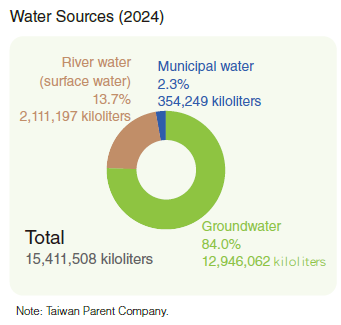 In 2024, the Taiwan Parent Company's total water withdrawal was 15,411 million liters, with surface water and groundwater accounting for 97.7% and tap water 2.3%. This was a decrease of 1,068 million liters from 2023. Total water consumption was 2,575 million liters. Water source management followed Water Resources Agency indicators, and water use was reduced in accordance with government regulations during supply restrictions. CLC's sites in Taiwan, Mainland China, and Vietnam were not located in areas of significant water stress.