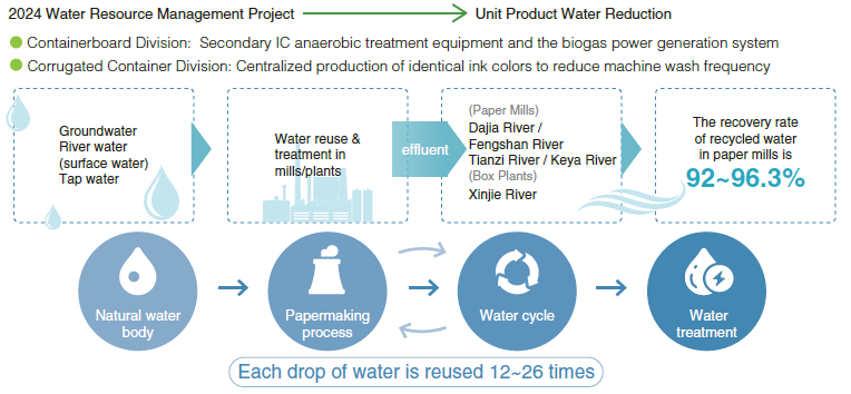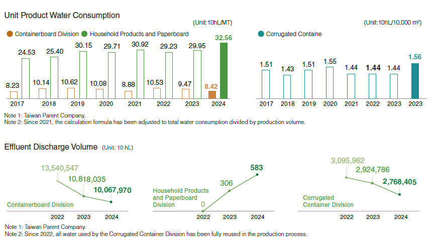 All CLC mills/plants are equipped with water treatment systems. The Containerboard and Household Products and Paperboard Divisions use biological treatment and regularly monitor effluent quality to ensure compliance with standards, and continue to implement the wastewater plant QC-Recorder to optimize water treatment operations. The Corrugated Container Division applies physical and chemical treatment and recycles treated wastewater for process rinsing and starch preparation, significantly reducing water consumption.