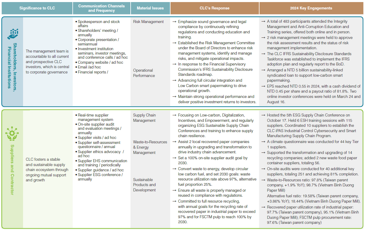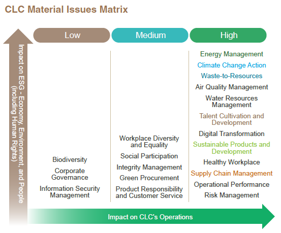 CLC's senior management and the sustainability committee Taskforce annually identify stakeholders and material issues, following GRI Standards (2021) and the EU Double Materiality principle to determine issues with significant impacts on both CLC and external economic, environmental, and social factors. Stakeholder scoring references the AA1000 Stakeholder Engagement Standard 2015, applying the principles of dependency, responsibility, tension/concern, influence, and diverse perspectives. The Taskforce conducts interviews with the Chairperson, President, and management, and completes stakeholder identification questionnaires to identify six main stakeholder groups: employees, customers, shareholders/investors/financial institutions, suppliers/contractors, government/industry associations, and society (media, neighboring communities, non-profit organizations, academic institutions). CLC engages these stakeholders through multiple channels, both regularly and as needed, to gather expectations and inform sustainability issue and impact assessments. The 2024 materiality identification process, analysis, and results are as follows: