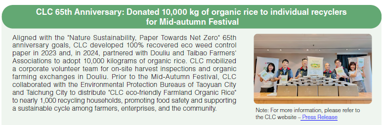 In 2024, CLC collected 4,625 tonnes of recovered paper through sorting campaigns, cleanups, and tree planting at each mill/ plant, with a total of 8,939 tonnes accumulated from 2020 to 2024. CLC has also adopted and maintained 80 public restrooms, supplied eco-friendly toilet paper, and received recognition from Taichung City Government. Tayuan Paper Mill established a water patrol team for stream cleanups and has adopted a river since 2016, receiving a certificate of appreciation from Taoyuan City Government. Hsinchu Paper Mill partnered with Hsinchu City Government to enhance water patrols by donating sun hats and rain boots.
