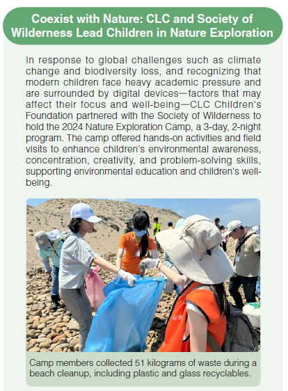 CLC has sponsored road running races, cycling events, concerts, calligraphy competitions, and painting activities for the elderly for multiple years. We have also provided funding, training equipment, and coaching resources for rural school sports events. In line with the Group's “Nature Sustainability, Paper toward Net Zero” goals, CLC has integrated internal resources and partnered with NGOs and government agencies to implement environmental education programs, advancing sustainable environmental awareness.
