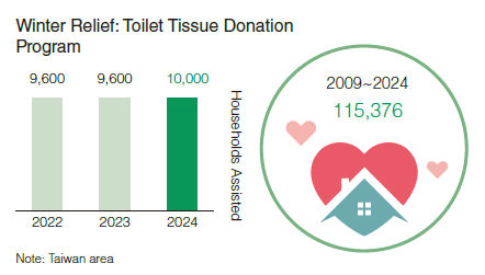 Since 1993, the Cheng Huo-Tien Charity Foundation has provided emergency assistance. From 2009 to 2024, it sponsored the "Winter Warmth Care for Underprivileged Families" program for 16 consecutive years, collaborating with 22 organizations including Hondao Senior Citizen's Welfare Foundation, Tayuan Jen-Sho Temple Foundation, Huashan Social Welfare Foundation, Genesis Social Welfare Foundation, and Taiwan Fund for Children and Families. The Foundation donated household products, benefiting 115,376 families. In 2024, NTD 3.77 million supported 81 cases, with a total of 383 cases assisted from 2020 to 2024.