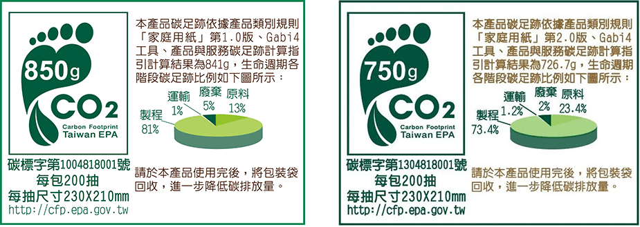 2010年本公司主動參加環保署「推動台灣碳標籤制度專案工作計畫」,完成蒲公英環保擦手紙產品碳足跡盤查,領先業界取得第一張產品碳足跡標籤證書,成為全國第一項取得「產品碳足跡標籤」及「環保標章」雙認證的家庭用紙產品。藉由導入產品碳足跡盤查制度,成功以生命週期評估系統計算蒲公英環保擦手紙從原料取得、製造、配送銷售、使用及廢棄回收等各階段所產生的溫室氣體排放量,並藉此改善不具效率的產銷過程,深化溫室氣體減量的執行環節。